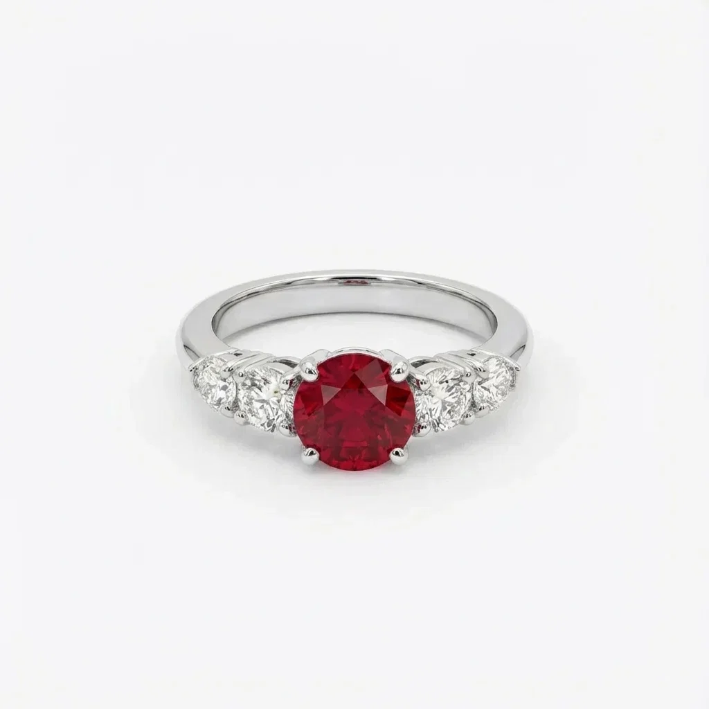 Cette bague est disponible en or blanc, or jaune, or rose et en or palladié. L’or palladié est un alliage premium d’or blanc enrichi de palladium, naturellement blanc, plus résistant, hypoallergénique. Elle peut être fabriquée avec un rubis central plus petit ou de qualité différente avec les 4 pierres d’accompagnement correspondantes.
